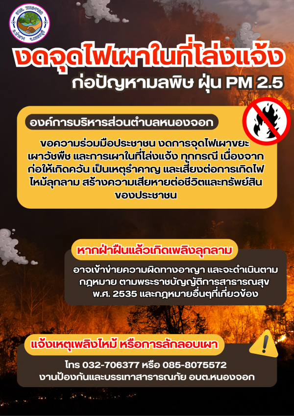 ประกาศจากองค์การบริหารส่วนตำบลหนองจอกขอความร่วมมือประชาชนงดการจุดไฟเผาขยะ เผาวัชพืช และการเผาในที่โล่งทุกกรณี